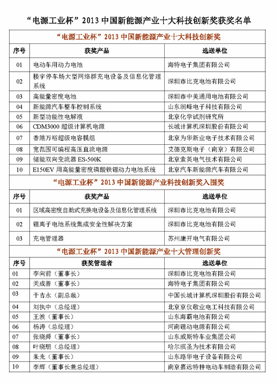附:2013中國新能源產業十大科技創新獎獲獎名單